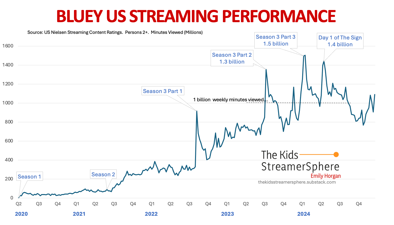 The history of Bluey is long. I’ve written a thesis amount of wordcount at this stage on how the show has grown from its origins. There’s a great accompanying chart to all the background, in fact. One of my favorites (because that’s the kind of person I am, I have favorite charts). But I also think it’s the most important data chart in kids streaming right now—and here’s why.